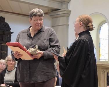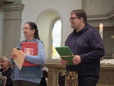 ... und zu danken hatten wir am vergangenen Sonntag nicht nur für 315 Jahre Chorgesang einiger Mitglieder im evang. Kirchenchor, sondern auch für 20 jähriges Dirigat unserer Dirigentin Heidrun Fundis, sowie der Organistin Barbara Retzbach, die uns und die Gemeinde genauso lange an Klavier und Orgel begleitet hat. Simon Becker, der diesen Part auch jahrelang ausgeführt hat, wurde im Laufe dieses Gottesdienstes verabschiedet - allerdings nicht ohne das Versprechen, jederzeit einzuspringen, falls Not am Mann bzw. der Orgel oder des Klaviers sei. Rolf Krüger bedankte sich bei ihnen im Namen der Kirchengemeinde mit einem Geschenk. Die Ehrungen der Chormitglieder übernahmen die Bezirkskantorin Bärbel Tschochochai zusammen mit Pfarrerin Julia Berggötz. Beide überreichten den Jubilaren die entsprechenden Urkunden mit persönlichen Worten des Dankes, während es vom Chor noch ein kleines Geschenk gab.