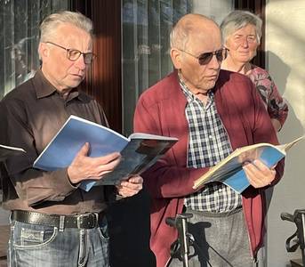 ... und versuchten, ihnen mit einigen alten und neuen Kirchenchorliedern, etwas Abwechslung in den Alltag zu bringen. Im Anschluss statteten wir unserem Basssänger E.J. Klarowitz einen Krankenbesuch ab und überbrachten ihm musikalisch unsere Genesungswünsche, bei denen er uns tatkräftig unterstützte. Wir wünschen ihm weiterhin gute Besserung, Gottes schützende Hand, seinen reichen Segen und dass er bald wieder an den Chorproben teilnehmen kann.